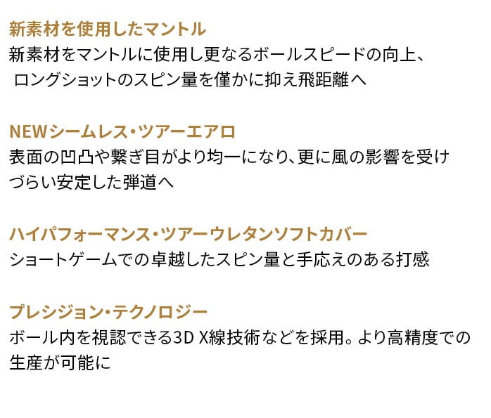 前作のCHROME TOUR Xボールはツアープロにも広く愛用されたボールでしたが、ロングショットのスピン量が少し多めである、という声も上がっていました。今回の新しい「CHROME TOUR Xボール」では、その要望に応えるべくマントル(コアから2層目)に新素材を採用し、カバーをさらに薄くすることで、ドライバーショットを含むロングショットのスピン量を抑えることに成功。なお、アイアンショットやグリーンサイドでのスピン量は、従来同様に高いレベルで維持したままとなっています。