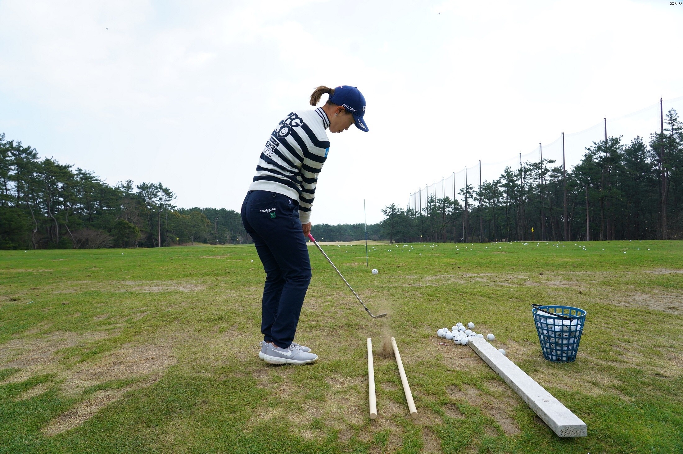 「自分の体にタテに振る感覚を覚えこませています。タテのイメージができたら良いだけなので、棒の間隔はだいたいですね。タテ振りをベースとして、出球の高さやスピン量をそろえたい。そうすれば、フェースを開いて上げるとか、ロフトを立てて転がすとか、他のアプローチも安定してくると思うんです」