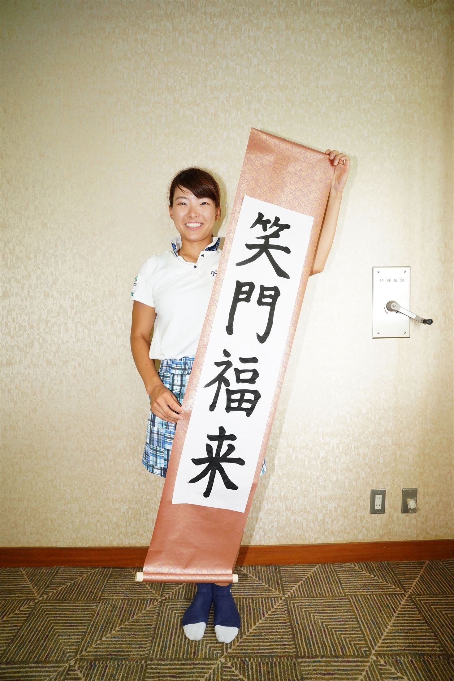 朝から渋野プロが育ったゴルフ場でシブコテクニックを青木翔コーチとともに伝授してもらい、室内に場所を変えて、今度は隠れた渋野プロの特技を披露してもらいました。いまでは有名な話ですが、小学校からはじめた習字は初等師範の腕前。ある言葉を書いてみてくださいとお願いしたところ、ためらいもなく、一気に書き上げたのが「笑門福来」。渋野プロにぴったりの言葉と思い、お願いをしました。