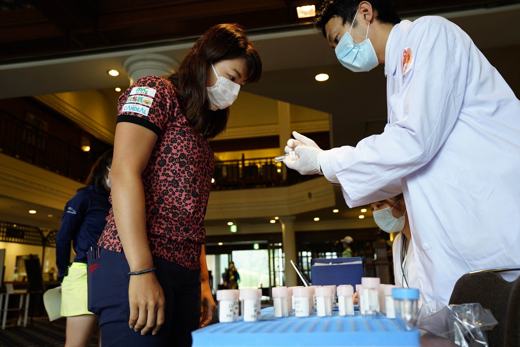 大会は25日(木)の初日に向けさまざまな新型コロナ感染拡大防止への対応策をとっており、コース入りの際には検温。この日は出場選手向けのPCR検査も始まっており、クラブハウス内は選手で混雑の様相だ。