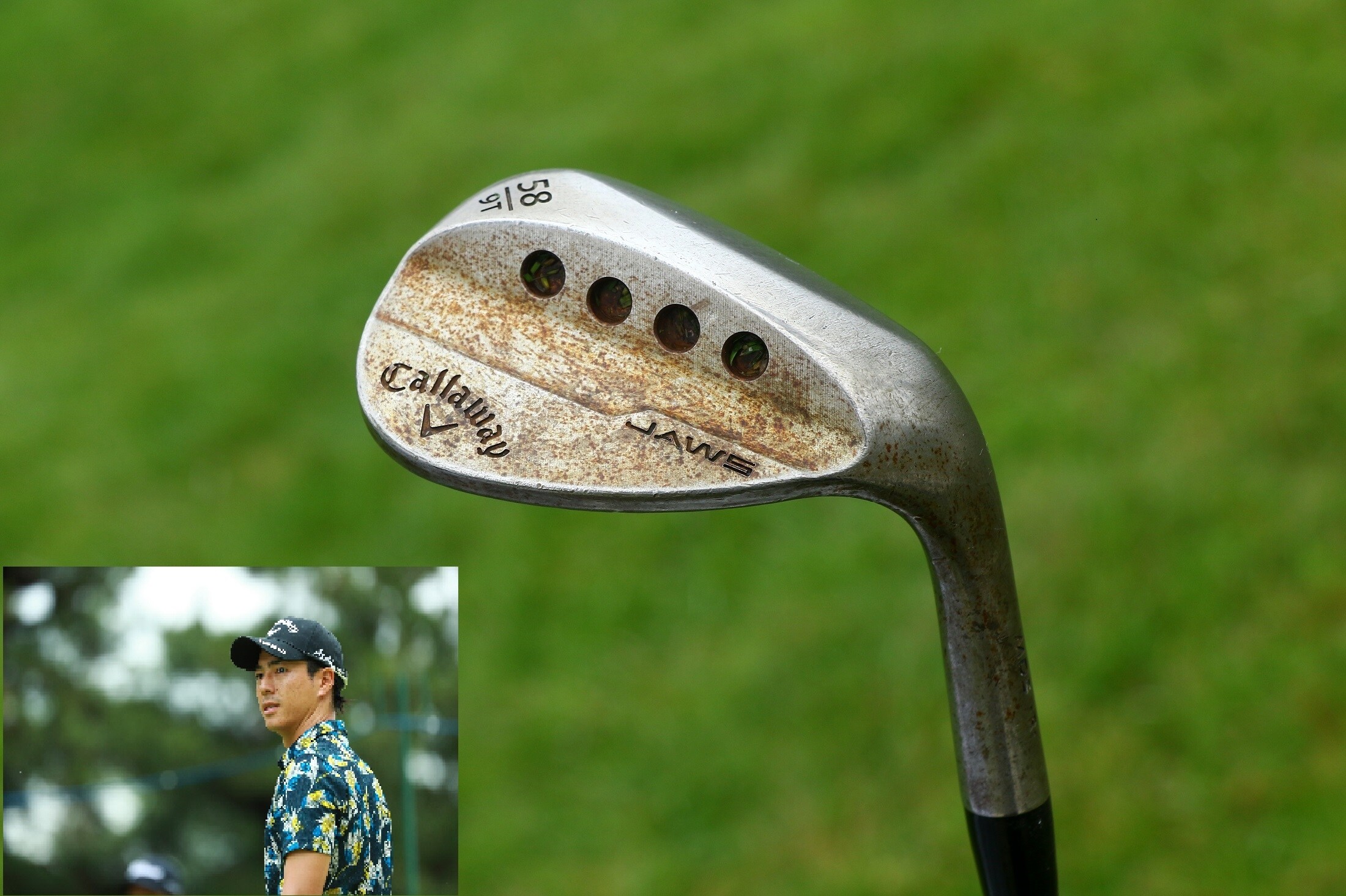 キャロウェイ担当者に聞くと、「中々替えられなかったのは、打感に敏感でこだわりが強いからですね。キャスト(鋳造製)の打感は“食いつき感が弱い”と打点位置がぼやけて感じるそう。今回入れた58度の『JAWSウェッジ プロトタイプ(軟鉄鍛造)』は“打感が食いつきつつ、高めの音が出る”と珍しく使用に至りました」とのこと。過去に米ツアーでPW-50度-58.5度-64度と、これまたロフト差のある3本を採用していた石川だが、5年ぶりのメジャーではどうなる!?