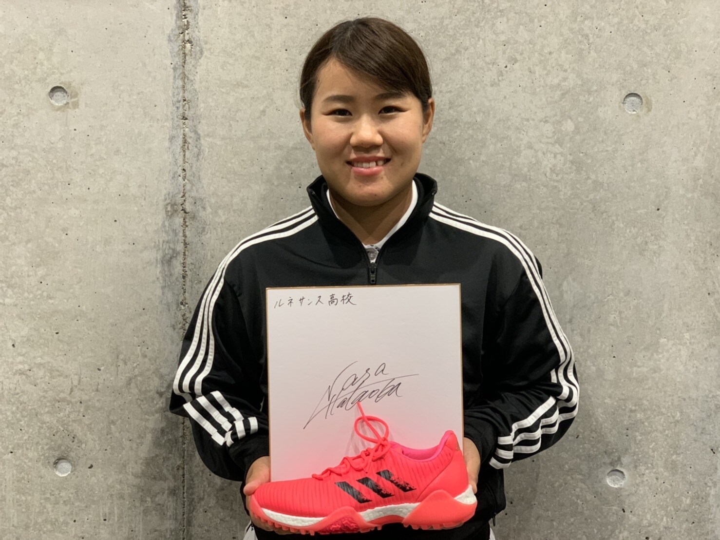「ルネサンス高校ゴルフ部のみなさんこんにちは。今回コロナの影響で目標にしていた大会が中止になったりと大変な状況にあると思います。徐々にスポーツの試合が再開してきていますので、これから試合ができる時は練習してきたことを存分に発揮できるようにがんばってください。私も試合が再開しそうなので1年後の大舞台に向けて一つでも多く試合で勝って自信をつけていけるようにがんばりたいと思います。お互いに、このアディダスのシューズをはいてがんばりましょう」