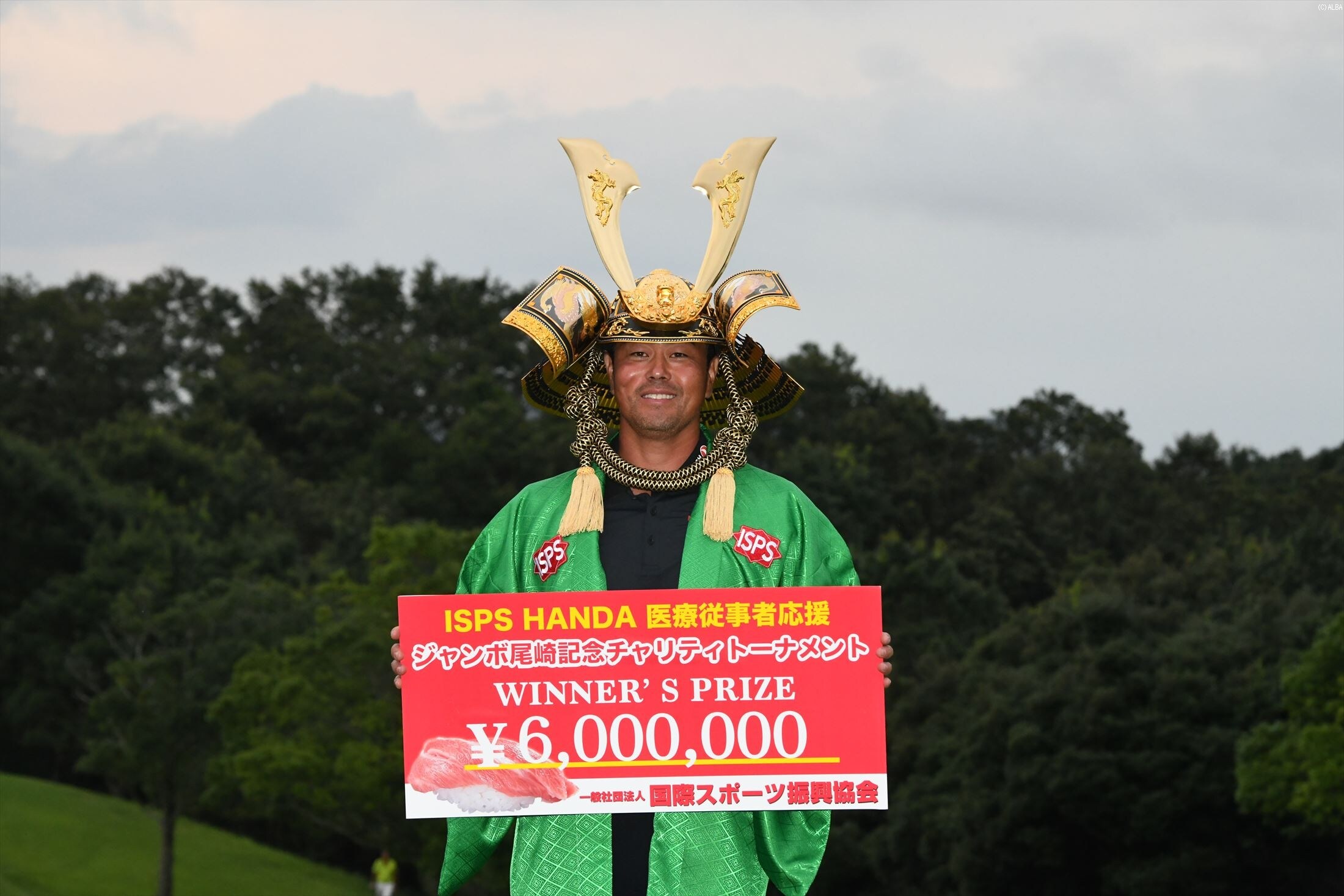 自身がホストプロを務める国際スポーツ振興協会(ISPS)の試合で、しかも「昔から大好き」というジャンボに優勝カップならぬ優勝兜をかぶせてもらい喜びもひとしお。ISPSの半田会長に「ホストの試合で優勝することはなかなかない。流石、谷原秀人ですね」と言われると、「はい、僕のためにありがとうございます」と笑った。