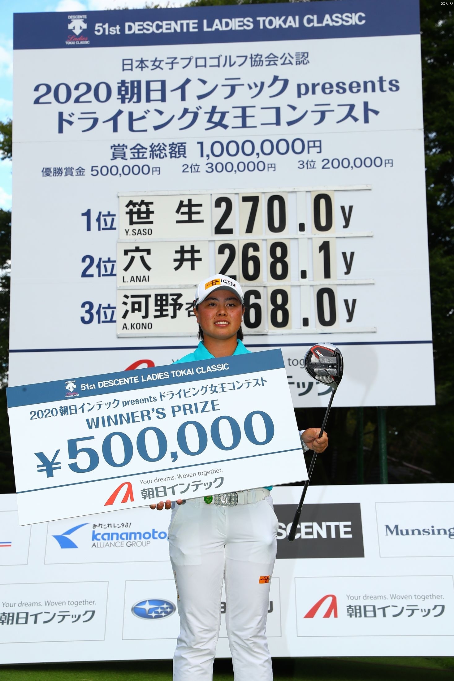 優勝したのは今季2勝を挙げているルーキーの笹生優花。1打目に「逆光でまぶしくてひっかけた」ものの、左のファーストカットに収まり出場選手唯一となる270ヤードを記録。ドラコン競技初出場ながら見事栄冠を手にした。