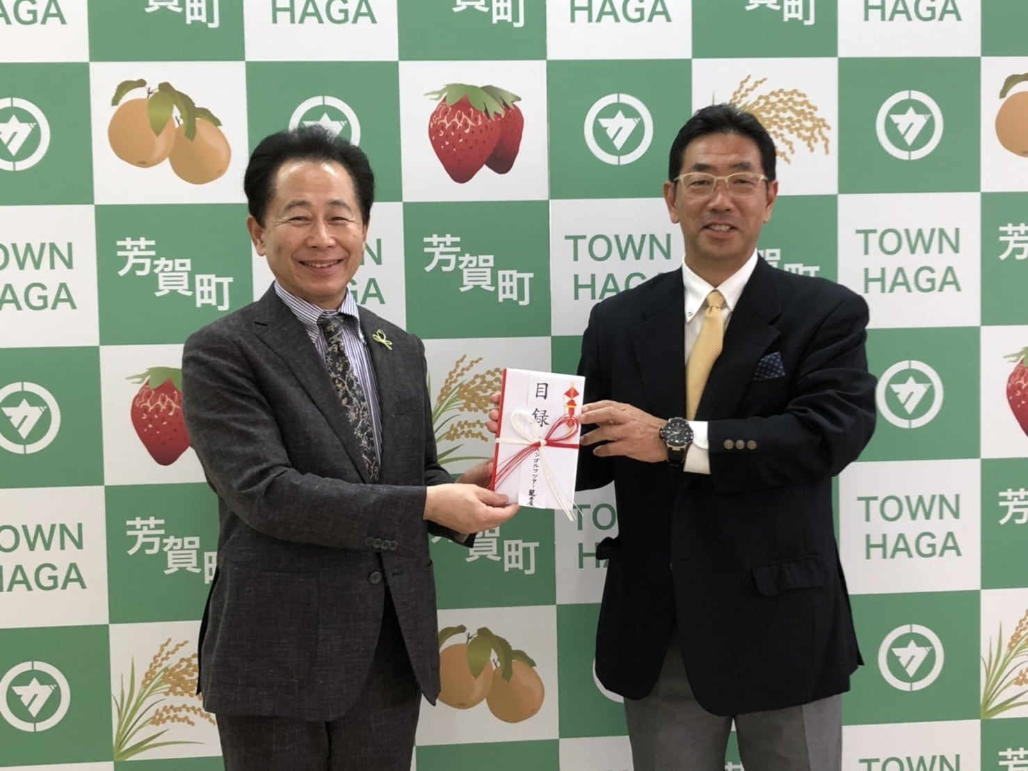 この日は栃木県芳賀町役場にて贈呈式がおこなわれ、ジャパンゴルフツアー選手会事務局小山和顕より芳賀町の見目匡(けんもく・ただし)町長に目録が渡された。