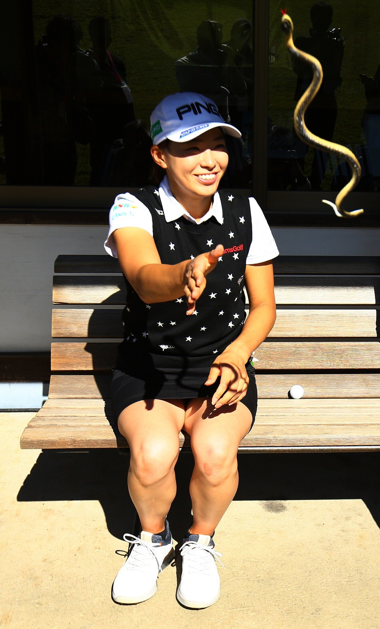 実はこれ、バッグの横にヘビのおもちゃが置いてあったのだが、これはぜんぶの渋野の仕業。「4月か5月ごろ後輩と100円ショップでヘビを買って、トレーナーさんがヘビが大嫌いだったので、そこでいろんな人を驚かすようになって、車にのっていたので桃子を驚かせようと思って」と、おちゃめないたずらだった。