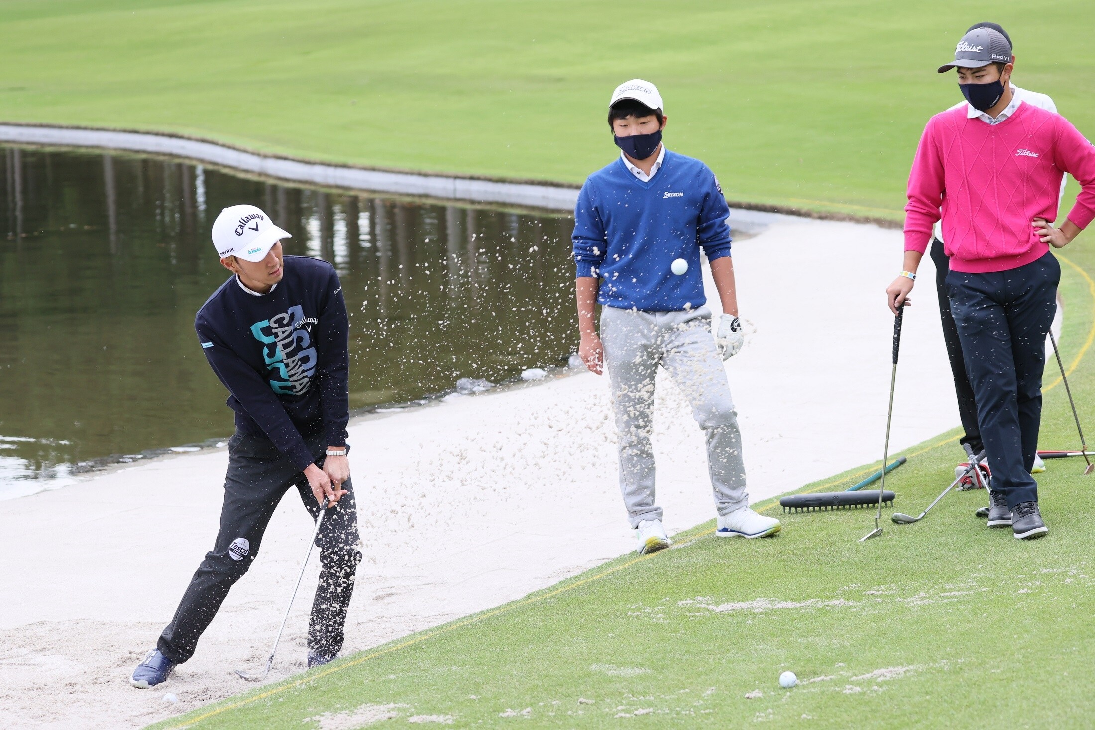 このアプローチでは、フェースを開いているのに、インサイドからバンスをつかってボールをつかまえることで、ボールは低くやわらかく飛び出し、強いスピンがかかる。それにサイドスピンが入らないので、ボールがラインに乗りやすくなるというわけだ。これには3人のジュニアたちは目を丸くしていた。実際のトーナメントコースを使った現役ツアープロの生レッスンは、今週のテレビ中継でも紹介される予定となっている。