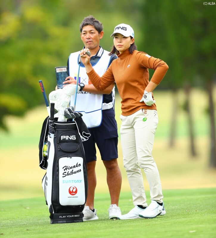 出だしの1番から連続バーディを奪った渋野は、途中停滞する場面もあったものの、折り返しての10番で1つ伸ばすと、13番パー5では花道からの3打目をしっかりと寄せて、さらに次の14番でも2打目をピンに絡めて連続バーディ。さらに16番パー5でもアプローチを寄せてスコアを伸ばし、首位と3打差で最初の18ホールをしめくくった。