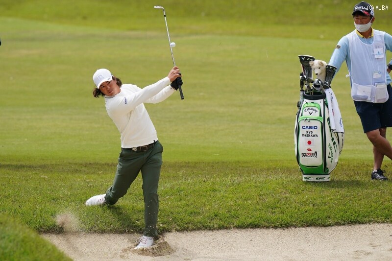 1番スタートの石川。短いパー4のティショットで3番ウッドを握りグリーンを狙ったが、これが右手前のバンカー手前のラフに止まる。左足はバンカーのなか。まともにアドレスが取れない状況から、パーをセーブするのがやっとだった。