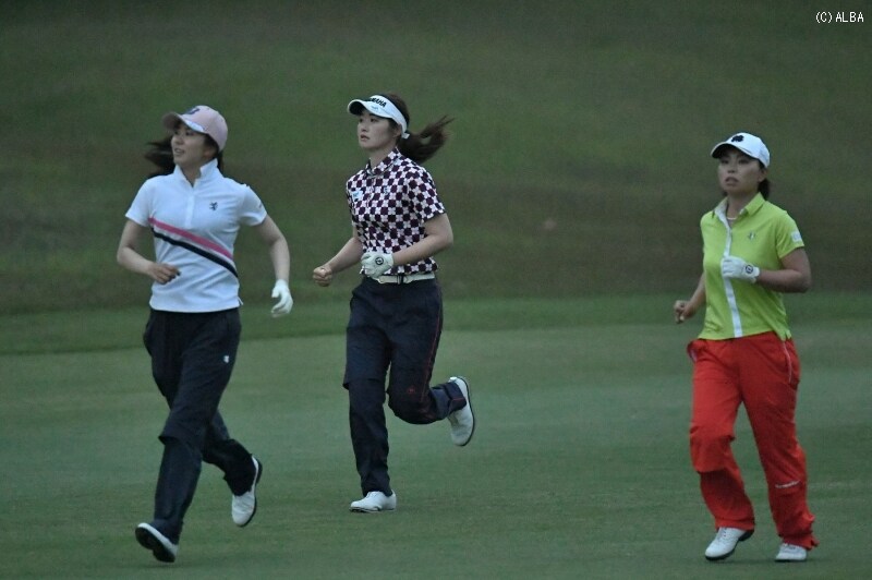 日没予定時刻から20分以上が過ぎた午後6時47分、この日競技を行った全組がホールアウトした。午前11時30分にプレーを開始した最終組の岩橋里衣、堀琴音、植竹希望は日がとっぷり暮れるなか、投光器が照らす光を頼りにこの日最後のパッティングを打った。