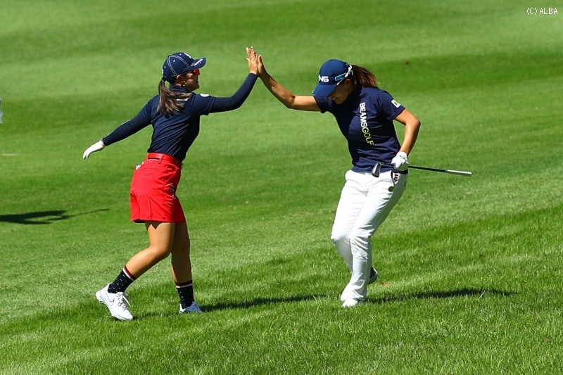 その時、急なつま先さがりの左ラフからの2打目を待っていた同組の渋野日向子も、このプレーに大喜び。吉田と同じようなタイミングでアドレスに入っていたのだが、プレーを中断。その音を聞くと「おー!先に打ってくれてありがとう! あとでハイタッチに行く!(笑)」と、笑顔で後輩を祝福した。すると自分のショットの後、すぐに吉田の元に駆け寄っていく。そして、うれしそうに宣言通りにハイタッチを交わした。