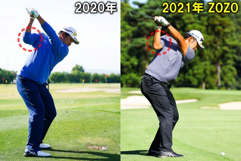 まず、昨年のスイング写真と比べて、明らかにトップが低くなっていると指摘。「右ワキを締めたまま体の回転とともにクラブを上げていて、以前より低いトップになっています。結果、ダウンスイング以降の体の動きがシンプルになり、クラブの動きが安定します」と、今まで以上に体の回転と腕が同調した結果が精度アップにつながったと、吉田氏は話す。