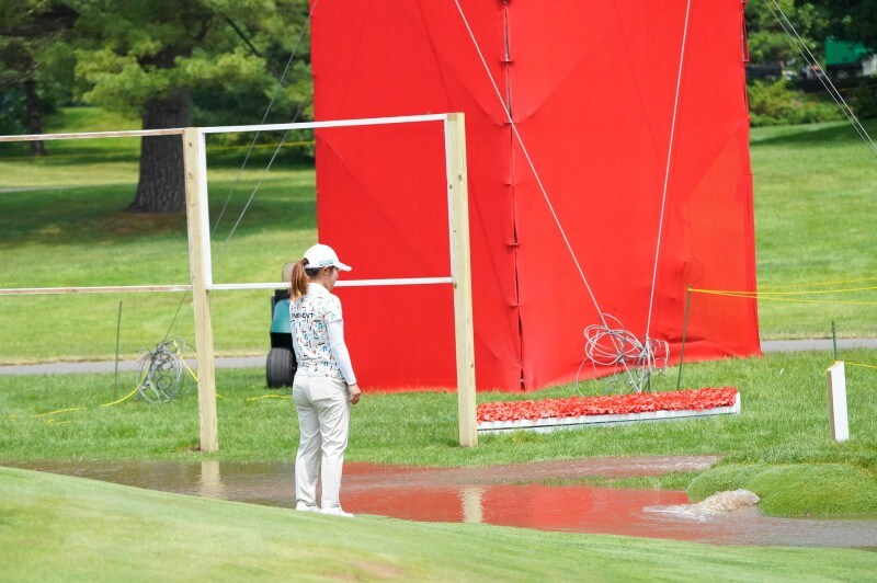 開幕目前ということもあり、コースでは選手のみならず、会場を設営するスタッフたちも酷暑のなか額に汗して働いている。ちょうど古江が18番グリーンに到達した頃、その奥ではロープを張るための杭を地面に打つ作業が行われていたのだが、これが思わぬ事態につながることに…。