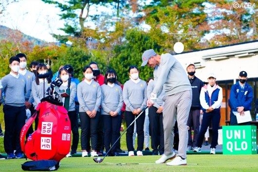 この日、スコットは「日本オープン」のプロアマに参加し、会場から車で40分ほど離れた六甲国際ゴルフ倶楽部に移動。イベントは15時30分過ぎから始まった。前半はJGAナショナルチームのヘッドコーチを務める同郷オーストラリア出身のガレス・ジョーンズ氏をインタビュアーに迎え、練習場でデモンストレーションを行い、後半はクラブハウス内で、ユニクロが取り組むSDGsについて、学生たちと一緒にセミナーを受けた。