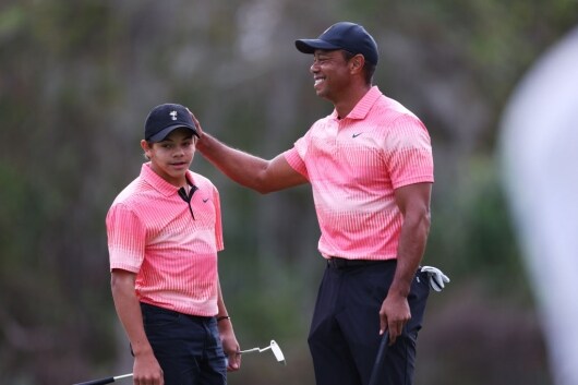 ところでタイガーとチャーリー君、1番ティでティショットを打ち終えると、米NBCテレビのカメラに向かってそろってタイガーの元夫人、チャーリー君の母であるエリンさんへ向けてコメントを送った。ごく最近、男の子が誕生したエリンさんに「おめでとう!」と祝福の声を届けた。
