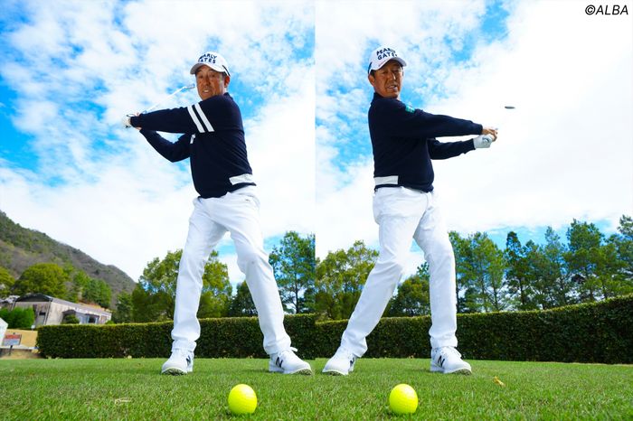 「スイング軸を安定せるには、7番アイアンでの連続素振りがオススメ。1つめのステップでは、正面でクラブを胸の高さに上げて、上体を左右に連続で回します」 スイング軸が崩れ、上体が傾けば連続で降ることができない。お腹を締めながら連続で振ると、背中に軸を感じられるようになる。同時に、両ワキを締めて手元を体の正面に置いたまま振る感覚も養えるという。 「2つめのステップでは、スイングを少し大きくします。トップとフォローで手首がL字になるように、連続で素振りをします。トップでは左腕が伸びて、フォローでは右腕が伸びて右手が上にくるように意識しましょう。手を走らせるようにアームローテーションさせると、次第に下半身に重みができて背中に軸を感じられるようになります」 ダウンスイングで上体が突っ込んでスライスが出る人ほど効果あり。ウェッジからドライバーまで全番手でスイング軸とヘッド軌道が安定し、大叩きの連鎖から抜け出せる。 注意したいのが、両腕を固定させて振る意識。バックスイングでは右ヒジをたたみ、フォローでは左ヒジをたたむことでフェースがターンしてボールがつかまる。しっかりとしたスイング軸の先に、今まで味わったことのない良い当たりが待っている。