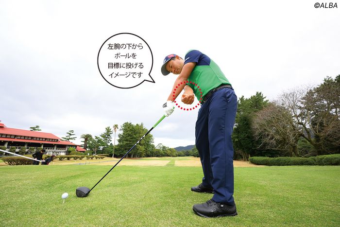 まず、ドライバーでアドレスを作り、右手だけを離します。そこからクラブと左腕は動かさずにしっかり胸を回してトップを作り、目標方向にボールを投げるイメージで右手を振ります。大切なのは、右手を左腕の下に通すこと。右手が左腕よりも高い位置を通るのは、カット打ちの動き。体の動きが止まったり、前傾が崩れる等々、悪いスイングにつながります。右手をしなやかに左腕の下を通すように振れればOK。このシャドースイングを繰り返し感覚を体に染み込ませましょう。そのイメージのままスイングをすれば、クラブをインから下ろせるようになります。弱々しいスライスを直せますよ。稲森佑貴いなもり・ゆうき/1994年生まれ、鹿児島県出身。国内ツアー通算4勝、メジャー2勝。7季連続でFWキープ率1位に輝いたドライバーの名手。国際スポーツ振興協会所属