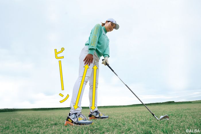 アイアンは、ただ飛ばせばいいクラブではありません。番手なりの距離を正確に刻みつつ、狙った方向に打ち出すには厚いインパクトを作る必要があります。そのために大切なポイントがセットアップ。両ヒザをピーンと伸ばすようにして、重心の高いアドレスを作るのです。