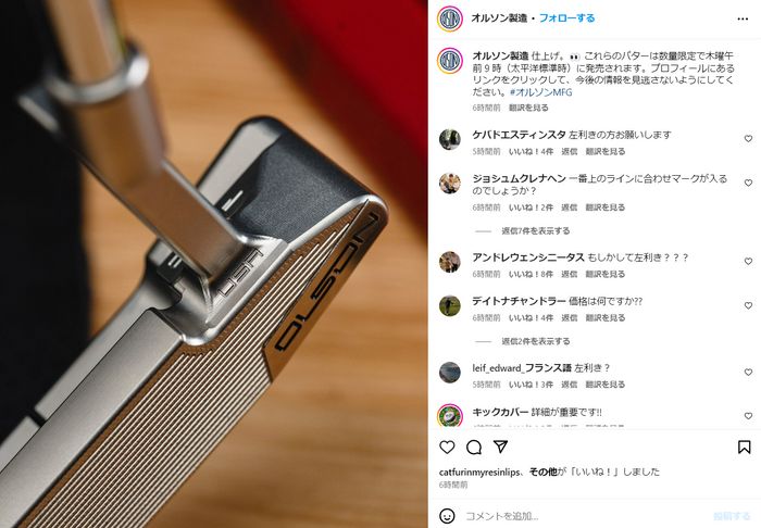 「価格はいくらですか??」「いくらですか?とても誘惑に駆られています」「詳細が重要です!!」「どうすれば入手できますか?リンクをクリックしましたが、購入できる場所が表示されません。また、価格はいくらですか?」「もうクレジットカードを持って行ってください」「いつものように、私はそれを手に入れるためにそこにいます!!」「新しいドロップを見るのは素晴らしいです@olsonmfg。あなたの最新のものは素晴らしいです」「海外に発送してもらえますか」「すっごくきれいですね!!!」「わかりました、それはセクシーです」「???」 また、これまでオルソン氏が投稿してきた新作はほぼすべてが右利き用のためか、「これらのうちのどれかが左利きバージョンになるでしょうか?」などと、待望の声も多数見られる。シェフラーの勝利後には、アクセス集中で繋がらなかった公式サイトも今は復活。同氏はメーリングリストの登録で、最新作の情報が得られる形を取っている。