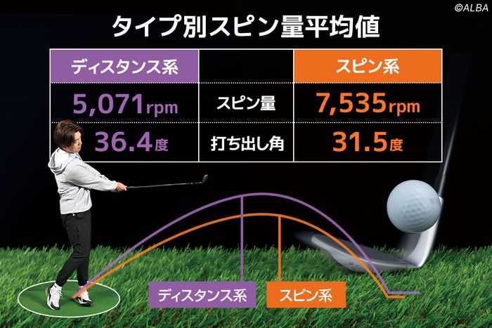 『GC4』を用いて各ボールでキャリー50ヤード(±3ヤード)のナイスショット5球の弾道を計測、平均するとスピン系とディスタンス系では打ち出し角で約5度、スピン量で約2,500回転/分(rpm)の差が出た。グリーン周りのコントロール性能を求める人はスピン系を選ぶのが正解だが、その中でも性能が分かれる。「例えば、スピン量が7,500rpm以上あって打ち出しが低めのものは、イメージ通りにスピンや球の高さを打ち分けられる半面、わずかな打点のズレがスピンのバラつきにつながるので、スイングの精度が必要になります。これに対し、スピン量が7,500rpm以下で打ち出し角が高めのものは、多少打点がズレてもスピン量の差が出にくく、アプローチスピンはかけたいけど、ある程度の寛容性も欲しいという人に合います」そして、ミスに対する許容度を優先するなら断然ディスタンス系。球離れが早いぶん、スピンはかかりにくいが、打点がズレてもスピン量が変わらないのでキャリーやランの距離が一定になりやすい。ピッチ&ランやコロがしに徹すれば、安定して寄せることができる。「状況に応じてスピンや球の高さを打ち分けたい中・上級者はウレタンカバーのスピン系が合いますが、同じ打ち方でオートマチックに寄せたい初・中級者はアイオノマーカバーのディスタンス系を一度使ってみるといいですよ」飛距離だけでなくアプローチでどんな弾道を打ちたいかによっても、ボールを選ぶことが大切になる。◇今回試打したボール◇【スピン系】テーラーメイド TP5テーラーメイド TP5xキャロウェイ クロムソフトキャロウェイ クロムツアーキャロウェイ クロムツアー Xブリヂストンゴルフ TOUR B XSブリヂストンゴルフ TOUR B Xダンロップ スリクソン Z-STARダンロップ スリクソン Z-STAR XVダンロップ スリクソン Z-STAR ?本間ゴルフ TW-S本間ゴルフ TW-Xミズノ RB TOURボルビック CONDORボルビック CONDOR X【ディスタンス系】ダンロップ ゼクシオ リバウンド ドライブUダンロップ スリクソン XmaXダンロップ スリクソン TRI-STARブリヂストンゴルフ TOUR B JGRキャロウェイ E・R・C ソフト本間ゴルフ D1ミズノ RB MAXボルビック VISTA3 PRISM360試打/解説 海老原秀聡えびはら・ひであき/2012年プロ入り。現在は「GOLF&FITNESS POINT芝浦」でインストラクターを務めている。正確なショットに定評があり、最新のスイング理論はもちろんギアにも精通している◇ ◇ ◇●HSがアマチュアと変わらない女子プロのセッティングを見ると、上達のヒントがつまっていた。関連記事【上田桃子さん、1WよりFWのシャフトが軟らかいのはなぜですか?【女子プロセットのどこマネる?】】で、FW上達のヒントが見つかる。