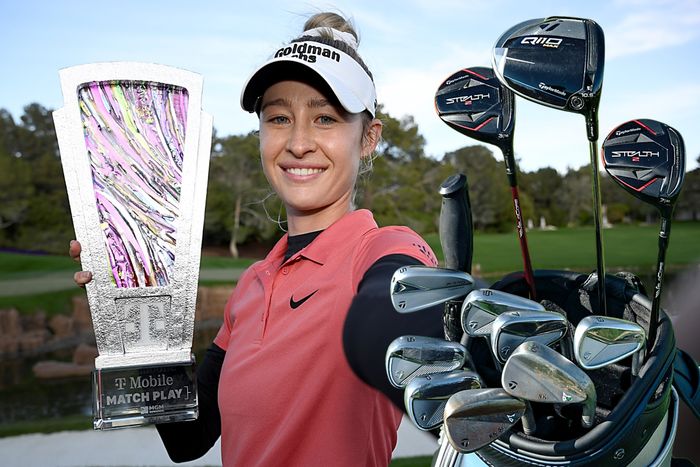 米国女子ツアーのマッチプレー戦は、ネリー・コルダ(米国)とレオナ・マグワイア(アイルランド)による決勝戦が行われ、4&3でネリーが優勝。通算12勝目で、ネリーはこれで「LPGAドライブオン選手権」から4連勝だ。08年のロレーナ・オチョア(メキシコ)以来となる4連勝は16年ぶり。5連勝は1978年のナンシー・ロペス(米国)、04-05年のアニカ・ソレンスタム(スウェーデン)が記録している。 契約する米国テーラーメイドも毎週のようにネリーの活躍を称えて使用ギアについて伝えており、今週は特に『TP5x』ボールで何がどう良くなったのか?を下記のように明かしている。 「ネリーは特にドライバーのスピン量を下げようとしていたので、昨年9月にいくつかテストを行いました。彼女のドライバーとアイアンで『TP5x』の利点が確認され、スピンが数百回転減少しました。またグリーン周りのチップショットで打ち出しが少し低くなり、『TP5』よりも『TP5x』の方がグリーン周りでより多くのスピンを生み出しました。彼女は『TP5x』の方が好ましい弾道でより多くのチェックを生み出せて以来、ボールに満足しています 『TP5x』への切り替えで、いくつかの主要な統計カテゴリが大幅に改善されました。フォードチャンピオンシップでの勝利の後、ネリーはラウンド当たりのSG:アプローチで2023年の『0.20』から2024年は『1.02』に、パーオン率も2023年の『73.4%』から2024年は『77.1%』に、そしてフェアウェイを外した後のパーオン率も『57%』から『63%』に改善しました。ネリーは2023年シーズンの終わりに『TP5x』ゴルフボールに切り替えました」(同社広報) また、同社はネリー・コルダのギアの中で「注目すべきスペック」の4本として、ドライバー、5I、7I、54度の詳細なスペックを紹介。スイングバランスは、地面から打つ番手は「C9」になるよう、長さが微調整されていることが分かる。 【ネリー・コルダの同社使用ギア】 1W:Qi10 MAX(表示10.5、リアル10° Diamana GT 60S 45.1875? D1.5 ツアーベルベット58 RD下巻き1重)3W:ステルス2(15° Ventus Red 7S)7W:ステルス2(21° Ventus Black 7S)5I:P770 (25.5° SteelFiber i80 cw 38.0625? C9 ツアーベルベット58 RD下巻き1重)6I〜PW:P7MC(7I:32° SteelFiber i80 cw 37.0625? C9 ツアーベルベット58 RD下巻き1重)A,SW:MG4(50SB,54SB SteelFiber i95 cw 35.8125? C9 ツアーベルベット58 RD下巻き1重)BALL:TP5x