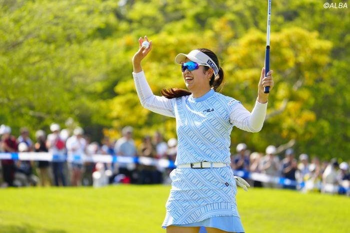 ◇トップタイで出た天本ハルカが最終ホールのパー3、約2.5メートルのパーパットを沈めてガッツポーズで喜ぶワンシーン。一時は首位と2打差以内に10人以上が並ぶ大混戦だった最終日、天本は5連続バーディで一気に後続を引き離し、トータル19アンダーでフィニッシュした。浜野GCでのトーナメントレコードは2019年に記録された『-12』。今大会では15人がそれを上回った。「FILA GOLF」契約の天本はラッフルがアクセントになったマーメイドラインのスカートと同柄のトップスで最終日をプレー。パナソニックブルーに馴染むウェアでツアー初優勝を果たした。
