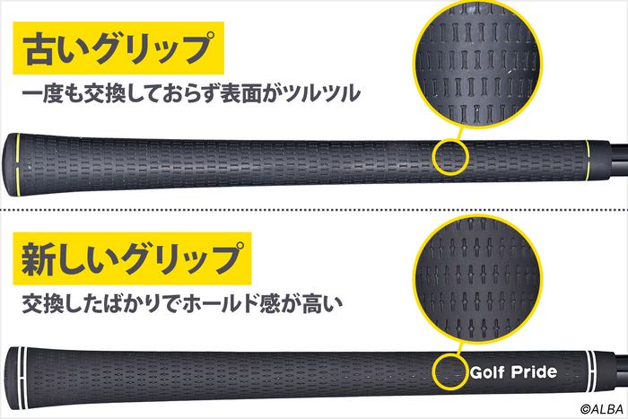 買ってから一度も交換していないツルツルのグリップ。新しいグリップに比べてどれくらいパフォーマンスが落ちるかをティーチングプロの橋本潜とアマチュアの黒崎和弘さんが試打をして調査した。