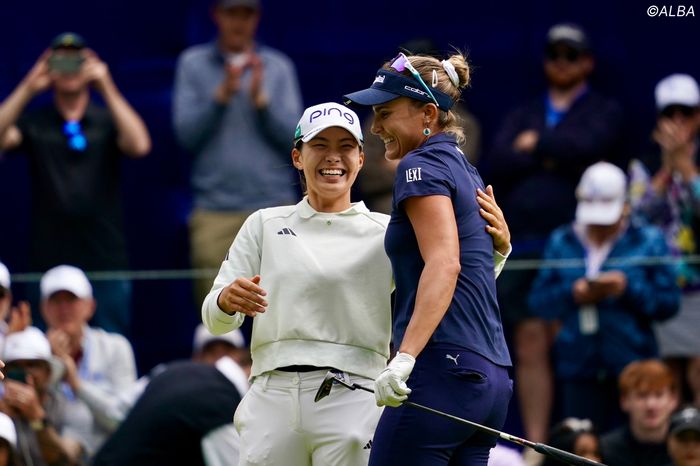 レクシーは3週間前の「全米女子オープン」でツアー撤退を表明。3位タイで予選ラウンドを終えたとき「レクシーと回りたい」と切望していたが、それが最終日に叶った。「『私、ここにいていいんかな』って申し訳ないと思いながら、観客気分でいました」と恐縮しつつも、“特等席”でレクシーの姿を目に焼き付けた。「SNSとかでレクシーの人柄をよく見るけれど、面と向かってみてもすごいんですよ。幸せ空気をくれる感じ。なんで辞めちゃうのかな、っていう。彼女には彼女の考えがあるけれど…。辞めないでほしいです。撤回してほしいなって」。いちファンとしての本音も、ポロリと漏らす。打ち下ろしで池越えの17番パー3では「ちょっとダフった」というティショットが、グリーンギリギリに落ちてピン2.5メートルについた。歓声を引き出すなか、レクシーが渋野に『私もきのう、同じことやったの』と声をかけ、忘れられないワンシーンになった。レクシーは前半1バーディ・4ボギー・2ダブルボギーの「43」と苦戦。だが、後半にボギーフリーの5バーディを奪取。最終18番では4メートルを決め、ひときわ大きな歓声を浴びた。ホールアウト後にはふたりにお願いをして、一緒に写真を撮った。「感慨深かったです」。全米女子プロについては開幕前に「あまりいい思い出がない」と話していたが、ここシアトルで、最高の記憶に塗り替えられた。(文・笠井あかり)