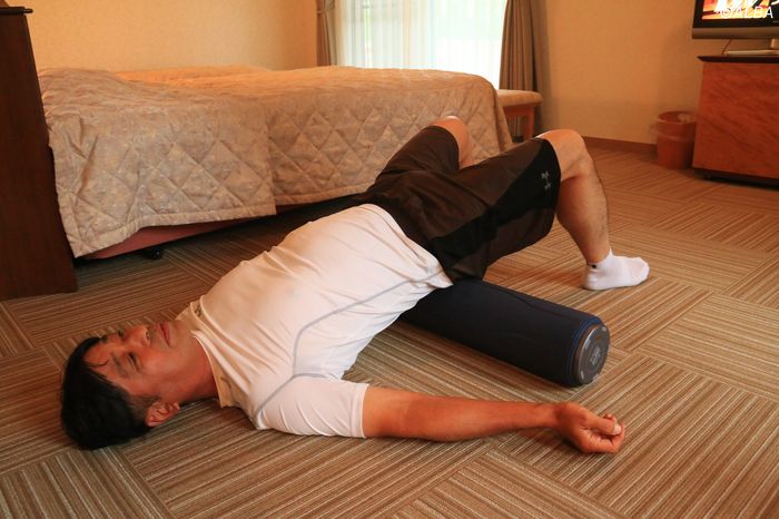 56歳になった今は国内シニアツアーを主戦場としているが、その華麗なスイングは健在だ。人間だれしも加齢により、若い頃に比べて柔軟性は落ちるもの。それを少しでも防ぐために「週5回」使っているものがあるという。ある試合の伊澤の宿舎に潜入取材をした。部屋に入ると1本のストレッチポールが転がっている。「これね、ただのストレッチポールじゃないんですよ」とニンマリする伊澤。おもむろにポールを横向きにして腰部分に当てる。伊澤が上下に動きながらストレッチをしているように見えるが…右手に持った円盤のボタンを押しはじめた。ブルブルブルブル…と振動が始まった。腰や背中、臀部、そして上体を起こして太モモ裏とふくらはぎに当てる。続いてポールをタテにして寝そべり、背骨や肩甲骨周りを中心にほぐしていく。「“ブルブル”が気持ちいいんですよ」とただのポールではなく振動機能がついている。これはゴルファーにもお馴染みのドクターエアの『ピラティスロール』と呼ばれるもので、全長約93.5センチ、直径15センチのサイズ感だ。振動は5段階で調整できる。「この6月から使っているのですが、お風呂上がりとかゴルフ前に10分ぐらいのって、ほぐしてからストレッチをします。また腰にハリを感じたら集中的にやったり、かなりほぐれますよ」。ポールに乗ったら30分ほどストレッチを行う。柔軟性を保つためにこの30分が日課になっているという。以前はガンタイプのマッサージ機を使ったこともあるが、「体の表面をやる場合はすごく効果がありますが、背中とか腰とか裏面は届かないし、無理に当てても体勢がきついですから。年なので(笑)。これは寝そべるだけでいいのでとても快適です」と目じりを下げる。レギュラーツアー時代は専属のトレーナーがラウンド前後にケアをしてもらっていたが、シニアになるとセルフケアが増えたため、「気軽に(ストレッチが)できるのがいい」としながら、「まだ夏なので使っていないんだけど…」と前置きしたう上で「あったかくなるんですよ。冬の寝起きとか乗りたくなっちゃいますね」と45度以下に温まるヒーターモードがあることも教えてくれた。先日は海の向こう「全米シニアオープン」で藤田寛之がプレーオフで惜敗して2位となった。当然伊澤も刺激を受けている。体の柔軟性を保ちながら、美スイングで再びアメリカで旋風を起こすことに期待したい。
