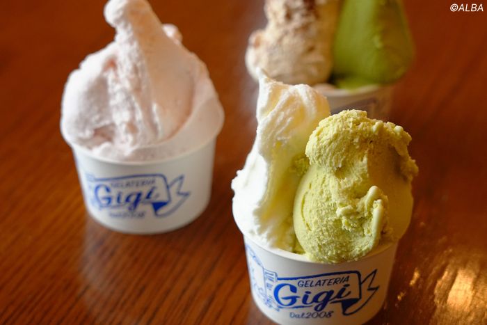 ◇今週の国内女子ツアー「北海道meijiカップ」の開催地は北海道。開催コースの札幌国際カントリークラブ 島松コースがある北広島市に隣接する恵庭出身の阿部未悠に、おすすめフードを聞いてみた。すると教えてくれたのは、ジェラート屋さん。「ジジというお店のジェラートがおいしいです。わたしのド定番はミルクとピスタチオ。北海道の牛乳は本当においしいので、ぜひ行ってみてください!」。広大な大地という最高の環境で育った牛からとれた牛乳で作られるデザート。地元に愛される人気店のようだ。コースから千歳方面に車を走らせることわずか15分ほど。恵庭駅からも歩いて10分ほどの位置にそのお店『ジェラテリア ジジ』はあった。目を引く黄色に塗られた外装はジェラートの本場・イタリアらしさも感じさせる。涼しい夏の北海道で、この日は最高気温25度ほど。夕方には雨もパラついていたが、閉店1時間前に入店すると在庫もかなり少なく、人気店であることが容易に想像できる。お店は2008年に、イタリア修行をしたオーナーがオープン。隣には2004年に先にオープンしたイタリア料理店が構えられている。『阿部未悠プロが地元のおススメ店と紹介してくれて…』と伝えると、統括マネージャーであり店長の太田裕也さんは「僕はあまりゴルフは詳しくないんですが…、地元紙の表紙をされていましたよ!」と冊子を見せてくれた。プロゴルファーでは石川遼も訪れたことがあるのだとか。一番人気はやはり、阿部も「絶対に入れる」という“おいしい牛乳(ミルク)”。そしてこの日の一押しは“ストロベリーラッテ”だった。「これはイチゴをつぶして牛乳に混ぜているだけなんです。ミルクのおいしさを生かしつつ、いい味に仕上がりました」。春の期間限定メニューである焼きリンゴ“メーレコッテ”が8月にあるのはスーパーレア。「デザートフェスタを始めたことでたくさん作ったので、今週登場しているんです。知っている人からしたら、『なんでこの時期にあるの!?』と驚かれるんですよ」。夏限定のブラッドオレンジ、抹茶など、10種類以上が常時ラインナップされている。どの味を食べてみても、まず驚かされるのはミルクの濃厚さ。濃すぎず、ほどよい香りと甘みを漂わせている。太田さんは胸を張る。「契約農家さんの搾乳を手伝うことから一日が始まるんです(笑)。搾りたての牛乳を低温殺菌して、フルーツや食材などを加えるんです。一日寝かせてジェラートにさせて、お店に並べています。ラインナップも毎日変わるんです」と説明する。さらに驚いたのは、恵庭市のふるさと納税の返礼品にも選ばれていること。「おかげさまで人気で、全国各地からご注文をいただいています」と、業務用サイズの2リットルサイズが届けられる。北海道に来た人はもちろん、来る機会がなかなか難しい方も、恵庭のおいしさがぎっしり詰まったジェラートを注文してみてはいかが?