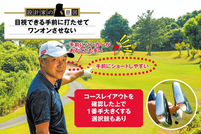 ◇ ◇ ◇日本のコースでは、海外に比べると長い距離のパー3は少ない。白ティから回っていれば、ミドルアイアンやショートアイアンで打つ機会も多いと思います。しかし、距離が短くても砲台や打ち上げでグリーン面が見えないパー3は要注意です。設計家は、グリーン面を見せないことで距離感を出しにくくし、ショートのミスを誘っているケースが多いと思います。ティーイングエリアに立ったとき、ゴルファーの心理としては見える位置にボールを打ちたい。だからグリーンの手前に打ってしまうのです。砲台や打ち上げのパー3の手前にはバンカーが設置されていることも多いと思いますが、ショートのミスを想定して作られていると思いますね。マネジメントのセオリーとして、「手前から攻める」というものがありますが、砲台や打ち上げグリーンであれば意外と奥がセーフになっていることもある。もちろん、奥に池やバンカーがないことを確認した上の話ですが、番手を一つ上げるのもアリです。砲台グリーンの場合、手前から攻めるとアプローチもグリーン面が見えずに寄せづらい。ワンオンしなかった上に寄せられないとダブルボギーの可能性も高くなってしまうので、思い切った番手選択をしてみてくださいね。