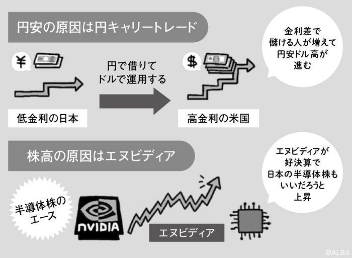 ――確かパリ五輪の前だったと思うけど、円が160円台になって、株価は4万円を超えましたよね。あれは米国の金利が高くて日本の金利が安かったからですか? 円安になったから、株が上がったってことですか?全部『円キャリートレード』のせい。これ一択です。別に米国が強い弱いとか、日本が強い弱いとか関係ないです。――『円キャリートレード』?『円キャリートレード』は、低金利の円(日本政策金利0.25%)を借りてドルなどの高金利通貨(米国政策金利4.75〜5.00%)に換えて運用し、金利差で収益を得る取引です。円を売ってドルを買うため、『円キャリートレード』が活発になると円安ドル高が進みやすくなります。――それって日本の株価が上がり続けていることにも関係ありますか?日本の株価が上がり続けていたのは、円安の背景がすごく大きい。でも「なんで円安になったのか」が非常に重要で、それは全て需給の問題です。円安になれば輸出産業の自動車メーカーなどが儲かるので、実質的に日本株は円安の方が株価は上がるようにできている。だけど、為替が円安に向いたのは、日本が弱いわけでもないんです。そこは全て『円キャリートレード』で説明ができます。――輸出産業の株がグッと上がったから他の株も上がったということ?違います。『円キャリートレード』が加速して、輸出関連株を中心に日本株を押し上げたんです。一説には「600兆円の円キャリートレードが円安を引き起こしていた」とも言われているんです。――へ〜。そうなんだ。投資中級者になるためには、世界最大の半導体株であるアメリカのエヌビディアの動向にはしっかりと目を凝らし続けて欲しい。エヌビディアの好業績を受けて、日本の半導体株が上がり、一気に日経平均株価を押し上げたのも要因の一つなんです。――米国の半導体株が、日経平均株価にも関係するんですか?そうなんです。実は日経平均株価の銘柄の構成比率は、現在半導体銘柄が多くを占めています。言い方を変えると半導体関連銘柄が上がれば日経平均は上がるし、逆も然りなんです。世界最大手半導体メーカーであるエヌディビアの株価が上昇すれば、日本の半導体株もいいだろうということで、日経平均株価も動くといっても過言ではないと思います。8月末にエヌディビアの決算が発表されましたが、成長の勢いに陰りが見えたことも、8月の日経平均株価を大きく押し下げる要因になっていました。――最近注目の半導体株は、米国のエヌビディア次第なんですね。エヌビディア株は注目し続けますね。【覚えておきたい用語】■円キャリートレード金融用語における「キャリー」は、資産を保有することによって得られる利益のこと。「トレード」は取引の意味。低金利の円を借り入れて高金利の通貨で運用することで、金利差によって収益を得る。■エヌビディア主にGPU(グラフィックボード)を開発・販売するAI半導体メーカー。2024年6月には時価総額が3兆3,300億ドル余りとなり、IT大手のマイクロソフトを抜いて初の世界1位にもなっている。解説/若林史江20歳で株式投資を始めた元祖・美人トレーダー。近著に『証券口座の開き方から教えます! 投資の学校 1年生1学期』(宝島社)。TOKYO MX『5時に夢中!』出演中。ゴルフ歴23年、ベストスコア76。(構成/日本ゴルフジャーナリスト協会会長・小川 朗)◇ ◇ ◇強くて可愛い姿にメロメロ?→関連記事【韓国女子ツアーは美人だらけ!「実力と美貌を兼ね備えた選りすぐりの10人を写真で紹介」】をチェック!
