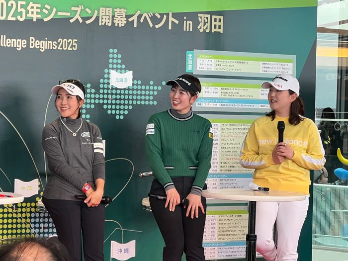 22日、羽田空港第2ターミナルで「2025JLPGAブライトナートークショー」が行われ、青木瀬令奈、蛭田みな美、山内日菜子が登場した。