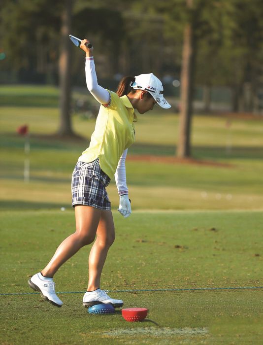 ◇ ◇ ◇元プロ野球選手・城島健司さんと酒を酌み交わしながら、打撃論を交わさせていただいています。「結局のところ手なんかどうでもいいんですよ。こうやってバチーンとやるのが、一番強く叩けるんです」。右ヒジを畳んでワキ腹に当てた城島さんは、「バチーン」という言葉を発すると同時に、右腰を鋭く回転させ力説してくれました。さらに付け加えて、「このとき、叩くのはヘソの前、つまり体の真正面です。これがボールに一番エネルギーを伝えられるんです。今の時代では不謹慎かも知れないけど、ビンタだって一緒じゃないですか(笑)」と、付け加えてくれました。これは打撃の真理をついているとボクは思います。そしてバットでもクラブでも、あるいは平手打ちでも、体の真正面で叩くのが最も強いのです。腕力のある一般男性のアマチュアが、体が小さい女子プロに飛距離で負けてしまうのは、実はここに理由があります。理由はひとつ。体の真正面でインパクトを迎えられないからに他なりません。左サイドが開いて振り遅れ。逆に腕が伸びてしまうアーリーリリース。スイングも打球もまったく違いますが、共通するのは体の真正面でインパクトできない一点です。何より重要なのが体の真正面がどこかを知り、そして体の真正面でボールを捉える練習をすることでしょう。プロがスイングの中で大事にしているもののひとつにバランスがあります。バランスのいいスイングは、誰もが追い求める理想です。まずバランスとは何か、バランスはどこでコントロールするものなのかを考えたいと思います。バランスには上下左右前後の6つがあります。結論を急げば、その6つが合わさった一点、それが臍下丹田(※せいかたんでん・おヘソの下5p辺り)だと考えています。バランスをコントロールするのはこの一点です。ボクと(上田)桃子が荒川博先生(王貞治氏に一本足打法を指導し、本塁打世界記録まで成長させた元巨人軍コーチ。辻村や上田桃子のゴルフの師匠でもある。2016年に死去)の指導を最初に受けたとき、先生はアドレスした桃子を指1本で押しました。前からお腹を押し、後ろから背中を押し、左右からワキ腹を押し、上から頭を押し、両ヒジを下から押しました。どこから押されても、たちまち桃子の体はグラつき倒れそうになりました。バランスは臍下丹田でコントロールしている。 当時、臍下丹田の重要性が分かったとしても、どう使うかが分かりませんでした。ただただ先生に押され、倒れないようアドレスするだけです。踏ん張れば踏ん張るほど、グラつくことも知りました。太い竹の上やバランスポールの上に立って構える練習もしました。平均台の上に立って素振りもしました。バランスの悪い状況を作れば、バランスが身に付くと思ったからです。そうした訓練の中で、3つの言葉が浮かび上がってきました。「内」「真ん中」「下」の3つです。先にバランスには前後左右上下の6つがあると言いました。前後でいえば体の内、左右でいえば真ん中、上下でいえば下。上手に立てたときには、これが合わさった一点が熱くなります。これが臍下丹田であることを言葉ではなく実感した瞬間でした。臍下丹田を意識し、そこを熱くするために、ぜひやってもらいたいドリルがあります。両手でALBA本誌(雑誌)を挟んでアドレスし、その状態で30秒かけてゆっくり振りましょう。もちろん、バランスを崩さないように。両手を合わせて雑誌を挟むと、重心が内に中に下に、そして一点に集まるのが分かるはずです。両手に少し力を入れて挟めば、腹圧が高まり、その一点、つまり臍下丹田が熱くなるのが分かるでしょう。ここがスイングバランスと、そして氣をコントロールするポイントです。練習場では上手く打てるのに……と嘆く読者も少なくはないでしょう。練習場は平らな場所からボールが打てます。ところがコースはほとんど傾斜地から打ちますから、バランスが悪い人は例外なく傾斜地が下手です。傾斜地は立ち方もボールコンタクトも難しいからです。すでに述べたように、そうした人はバランスの悪い状況を作り出して練習しましょう。太い竹やバランスポールは無理でも、コースの細い足場などで、バランスを崩さないように素振りをしてみましょう。また、フローリングの真っすぐな線に沿って立ち振るのもいいでしょう。バランスが悪いとフィニッシュで線から足がはみ出てしまいます。かつて宮里藍プロは、米ツアーでも片足で素振りをしていました。これもバランスを良くする練習といえるでしょう。不調に陥るほど、軸を保ってバランス良く振る練習をしたそうです。最後にもうひとつ。力任せは、バランスを崩す大きな原因です。それが体の真正面でインパクトできない最大の理由。そんな人は目の前にゴルフバッグを置き、右手でも左手でもバッグをビンタしたらいいのです。もちろん体の真正面で。■辻村明志つじむら・はるゆき/1975年生まれ、福岡県出身。上