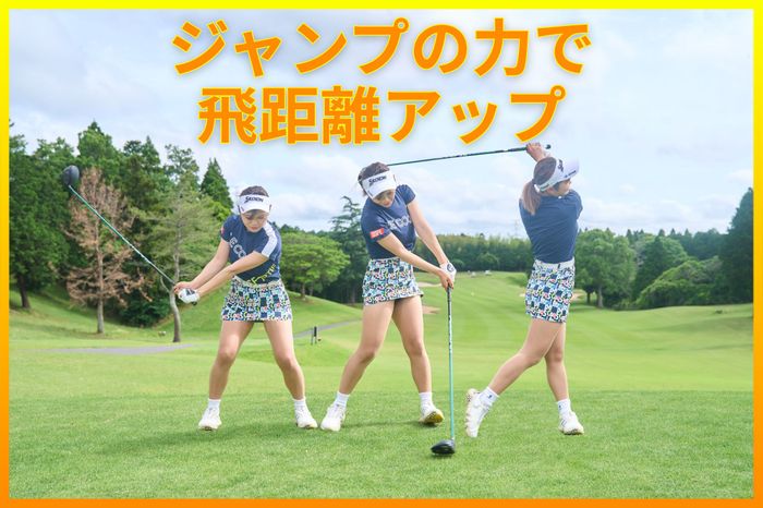 ◇ ◇ ◇ヘッドスピードを上げるためにジャンプは欠かせません。私もドライバーショットのときはジャンプを使って飛距離を伸ばしています。ただ、うまくジャンプできないアマチュアの方も多いと思います。原因は沈み込めていないこと。その場でジャンプするときに棒立ちのまま飛ぶ人はいませんよね? 切り返し直後に沈み込むことで、しっかりジャンプできるようになります。沈み込むときに腰を前に出すのはNG。上体が起き上がってしまいジャンプしづらくなってしまいます。お尻を突き出して右股関節に乗るように沈み込めば、前傾角度が崩れません。インパクト付近でジャンプするときは、左股関節を後ろに引くと体を回しやすくなりますよ。沈み込むやジャンプのタイミングがつかめないという人は「ベートーヴェン」のリズムを試してみてください。「べー」でトップまで上げたら「トー」で沈み込み、「ヴェン」でジャンプ。左右の股関節を使ってジャンプできるようになれば、ダイナミックなスイングで飛距離も伸びますよ。