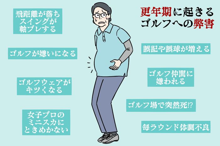 「初期症状はうつ病と症状が似ています。うつ病と診断されると抗うつ剤で治療しますが、抗うつ剤の中にはテストステロン値を下げる作用があるものも。そのため、男性更年期障害だった場合、症状が悪化します。更年期障害の疑いがある場合は、誤診を防ぐためにも泌尿器科や男性更年期外来を受診して、テストステロン値を測りましょう」更年期障害に陥るとゴルフにも悪影響を及ぼす。では具体的にどんな弊害が出るのだろうか。■誤記や誤球が増える更年期の症状の一つが、記憶障害だ。テストステロン値が低い人ほど、認知症になりやすいという研究結果も上がっている。逆を返せば、更年期予防は認知症予防に直結する。■ゴルフ仲間に嫌われる前の組のプレーが遅い、同伴者がミスばかりする、キャディがラインを読み間違えたなど、ささいなことにイライラしやすくなる。そんなあなたに、仲間も辟易?■ゴルフ場で突然死!?内臓脂肪の増加により血管が硬化。動脈硬化が進めば、心筋梗塞などの突然死もあり得る。動脈硬化が進むと陰茎に血液が流れにくくなるため、朝勃ちも減る。■毎ラウンド体調不良ほてり、のぼせ、耳鳴り、頭痛、だるさ、腰や肩の痛み……。更年期の不調は多岐にわたり、なんとなく体調が悪い不定愁訴が止まらない。常に絶不調でゴルフすることに……。■飛距離が落ちてスイングが軸ブレする遊離テストステロンが減ると筋肉は落ち、骨はスカスカに。結果、パワーがなくなり飛距離が落ち、ショートゲームだって不安定になる。ちょっとつまずいただけで、骨折する恐れも。■ゴルフが嫌いになるすべてにやる気がなくなり、趣味を放り出す人も多い。「あんなに好きだったゴルフをパタリとやめちゃった」というゴル友は、男性更年期だったのかもしれない。■ゴルフウェアがキツくなる筋肉は代謝量が多いため、落ちれば消費エネルギーが減少。また、テストステロンが減るとエネルギーを燃焼しにくい体質になる。そのため、内臓脂肪がたまり太っていく。■女子プロのミニスカにときめかない性欲減退は、男性更年期の特徴的な症状。「ムラムラから解放された」とスッキリしている場合じゃない。このままじゃウキウキもワクワクも、人生からなくなっていく……。大好きだったはずのゴルフがおっくうになったり、スコアや人間関係にも影響が出てしまっては、人生の楽しみが減ってしまう。似た症状を経験している人は、病院に受診するなど、早めの対策が重要だ。【解説】平澤精一ひらさわ・せいいち/マイシティクリニック総院長。日本メンズヘルス医学会所属。日本医科大学を卒業後、同付属病院勤務などを経て1992年マイシティクリニックを開業。男性更年期治療や高齢者の健康維持に積極的に取り組んでいる。『50歳をすぎて「最近、気力・体力が落ちた」と思ったら読む本』(フォレスト出版)など著書多数。◇ ◇ ◇1位〜10位にランクインしたのは?→関連記事【「オシャレだと思う女子プロ」ランキング! 原英莉花に河本結……ゴルフ界のファッションリーダーは誰だ?】