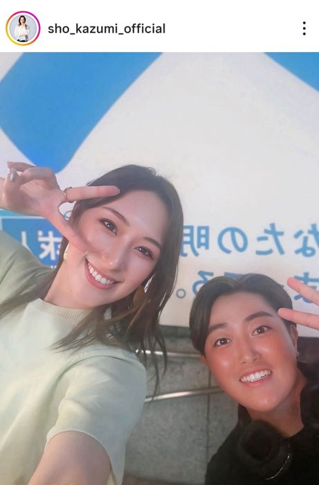 宝塚歌劇団花組の男役として活躍していた、元タカラジェンヌの和海しょうが自身のインスタグラムを更新。工藤遥加とピースをして写る笑顔の2ショットを投稿した。
