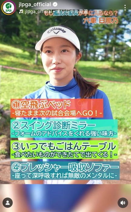 日本女子プロゴルフ協会が公式インスタグラムを更新。28日に開幕した「ニトリレディス」にちなんで、選手たちに「もし一つだけ“魔法の家具”が手に入るとしたら?」を質問する動画を投稿した。