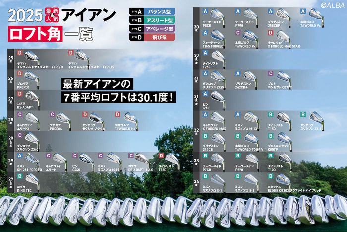 41モデルを集めて7番アイアンのロフト角を調べた結果、平均は30.17度。以前は29度前後が主流だったが、最新モデルではややロフトが寝ている傾向が見られた。ツアー1勝を挙げているギアに精通するプロゴルファー、市原建彦はこう話す。「数年前に比べると、ロフト26〜28度のストロングロフトは減り、29度、30度、32度といったモデルが増えています。ロフトが多めの方がスピン量が安定し、タテの距離感も合わせやすくなります。また、タイトリスト『T250 Launch SPEC』やミズノ『HLシリーズ』のように、アベレージゴルファーをターゲットにあえてロフトを寝かせたモデルも増えているので、試してみる価値はありますね」今回、ブレード長とロフト角を基準にアイアンを4タイプに分類。それぞれ4タイプの7番ロフトの平均も算出してみた。ブレード長78-81mm、ロフト角28-30度の【Aタイプ:バランス型】は、7番平均ロフト30.58度。シャープな顔を持ちながら、やさしい軟鉄鍛造モデルが多く、飛距離・操作性のバランスに優れる。人気モデルが集中し、『ZXi5』『T250』『i240』『ミズノプロ M-15』などが該当する。ブレード長78mm以下、ロフト角31度以上の【Bタイプ:アスリート型】は、7番平均ロフト32.54度。ロフトが31度以上あって、ブレード長が短い特徴を持つ。スピン性能、操作性が高くて、上から打ち込める人に適する。『P7CB』『T150』『ZXi7』『241CB』『ミズノプロ S-1』などが該当する。ブレード長80mm以上、7番ロフト角28-30度の【Cタイプ:アベレージ型】は、7番平均ロフト29.05度。ミスヒットに強く、打球が上がりやすい。『エリート』『G440』『PRGR04』『C07PC』などが該当する。『G440』は今季ロングセラーとなっているモデルだ。ブレード長79mm以上、7番ロフト角25-30度の【Dタイプ:飛び系】は、7番平均ロフト27.25度。ストロングロフト設計で、低スピンかつ高弾道の飛びが狙える。ブレード長も長く、ミスに強く1番手上の飛びを狙うシニア層に受けている。『ゼクシオプライム』『インプレス ドライブスターTYPE/D』『T//WORLD Hx』『DS-ADAPT』などがそれに当たる。ロフト角という視点でアイアンを選ぶと、自分に合う一本が見つかりやすくなるかもしれない。★試打リスト【Aタイプ:バランス型】ブレード長 78-81mm ロフト角 28-30度テーラーメイド:P8CBテーラーメイド:P790キャロウェイ:X FORGED MAXピン:i240タイトリスト:T250ダンロップ:スリクソン ZXi5ミズノ:ミズノプロ M-13ミズノ:GH-251 FORGEDブリヂストン:258CBPブリヂストン:242CB+本間ゴルフ:T//WORLD Vxフォーティーン:TB-5 FORGED【Bタイプ:アスリート型】ブレード長 78mm以下 ロフト角 31度以上テーラーメイド:P7CBテーラーメイド:P770タイトリスト:T100タイトリスト:T150ダンロップ:スリクソン ZXi7ミズノ:ミズノプロ S-1ミズノ:ミズノプロ S-3ブリヂストン:241CB本間ゴルフ::T//WORLD TOUR Vコブラ:KING TECヨネックス:EZONE CB302 グラファイトハイブリッド鍛造プロトコンセプト:C05TP【Cタイプ:アベレージ型】ブレード長 80mm以上 ロフト角 28-30度キャロウェイ:エリートキャロウェイ:エリートXピン:G440ダンロップ:スリクソン ZXi4ミズノ:ミズノプロ M-15本間ゴルフ:T//WORLD Pxプロギア:PRGR04コブラ:DS-ADAPT MAXプロトコンセプト:C07PC【Dタイプ:飛び系】ブレード長 79mm以上 ロフト角25-30度キャロウェイ:X FORGED MAX STARタイトリスト:T350ダンロップ:ゼクシオプライムヤマハ:インプレス ドライブスターTYPE/Dヤマハ:インプレス ドライブスターTYPE/S本間ゴルフ:T//WORLD Hxプロギア:PRGR03コブラ:DS-ADAPT■解説・試打 市原建彦いちはら・たつひこ/ 1978年生まれ、神奈川県出身。1996年に世界ジュニアで優勝して、翌年プロ転向。2006年の「アサヒ緑健よみうり・麻生飯塚メモリアルオープン」でツアー初優勝を挙げている。◇ ◇ ◇人気アイアンシャフトを調査。関連記事『79mm前後に人気モデルが集中! 最新アイアンの性格は“ブレード長”で8割決まる【アイアン41モデル比較】』で詳細をチェックできる。