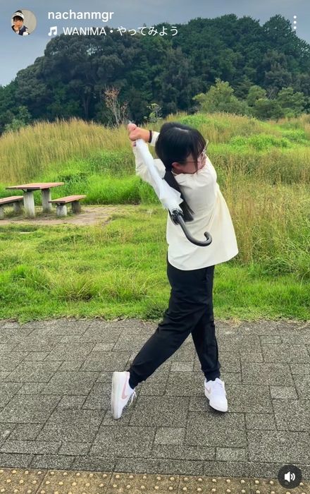菅沼菜々のマネジャーが公式インスタグラムを更新。車移動の休憩時間に、菅沼が傘で念入りにスイングチェックをする姿を動画で投稿した。