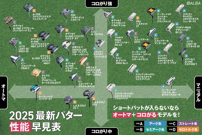 パターに精通するティーチングプロ、追分浩一が最新34モデルを実際に試打。タテ軸を「ボールのコロがりの強さ」、ヨコ軸を「操作性」として分類し、性能早見表を作成した。タイプは以下の4種類に分かれる。真っすぐストロークできる【ストレート系】、わずかにフェースを開閉する【セミアーク系】、フェースターンで打つ【アーク系】、新感覚の【ゼロトルク系】。表を見ると、右上に位置するのは“コロがりが良く、フェースターンで打てる”アーク系モデル。『スタジオスタイル ニューポート2』『スタジオスタイル ニューポート プラス』『オデッセイ Ai-ONE ミルド ONE T』など、人気のブレード型が並んでいる。意外だったのは、山下美夢有や岩井明愛が使用する、フェースの開閉が可能なネオマレット系モデルが右上に位置している点。『スパイダー ツアーX トゥルーパス スモールスラント』、『スパイダー ツアーX クランクネック』など、マレット特有の直進性を備えつつ、球をつかまえる感覚が持てる点が評価されているようだ。一方、最近注目を集めているゼロトルク系は、表の左側に位置する。『オデッセイ Ai-ONE スクエア2 スクエア ジェイルバード』、『オデッセイ Ai-ONE スクエア2 スクエア MAX1』などは、フェースの開閉がなく、それでいて“しっかりコロがる”球が打てるとあって、アマチュアにも人気が高い。ツアープロの間で大流行中の『L.A.B.GOLF DF3』、『L.A.B.GOLF OZ.1』、『テーラーメイド スパイダーZT』は左下に位置する。ハンドファースト形状でストレート軌道に振りやすく、さらに“コロがりすぎない”インサート素材が好評だ。「オートマチックに打てるのはフェースバランスの大型ヘッド(ストレート系)で、マニュアル操作でコントロールしやすいのはブレード型(アーク系)です。ショートパットに悩む人は“オートマ+コロがる”タイプを、ロングパットの距離感を合わせたい人は“マニュアル系”を選ぶのが鉄則ですね」(追分)性能早見表をチェックしながら、自分にピッタリのパターを見つけてほしい。【今回の試打リスト】★フェースを開閉できる 『アーク系』オデッセイ:Ai-ONE ミルド ONE Tテーラーメイド:TPトラスパター B1TH トラスヒールスコッティキャメロン:スタジオスタイル ニューポート2スコッティキャメロン:スタジオスタイル ニューポートプラススコッティキャメロン:スタジオスタイル スクエアバックスコッティキャメロン:ファントム5.5ピン:スコッツデール アンサー2Dミズノ:M.クラフト OMOI No.2コブラ:LIMIT3D ピスタ-45 3Dプロギア:PRGR デザインパターBC-33プロギア:PRGR デザインパターMS-63PXG:バトルレディ2 トルピード★わずかに開閉する 『セミアーク系』オデッセイ:マイクロヒンジ 2-Ball V-Lineオデッセイ:Ai-ONE トライビーム 2-Ballテーラーメイド:スパイダー ツアーX クランクネックテーラーメイド:スパイダー ツアーX トゥルーパス スモールスラントスコッティキャメロン:スタジオスタイル ファストバックコブラ:LIMIT 3D ENZO-3D★真っすぐ打てる 『ストレート系』オデッセイ:Ai-ONE ジラフビーム ジェイルバード ミニピン:スコッツデール DS72ピン:スコッツデール プライム タインCピン:スコッツデール CRAZ-Eミズノ:M クラフトXキャスコ:9/9 デルタフェース タートル GOLD9/9本間ゴルフ:SAKATA LAB CNC プレミアム パター LOONG本間ゴルフ:SAKATA LAB CNC プレミアム パター メカニック★トルクゼロの新感覚 『ゼロトルク系』オデッセイ:Ai-ONE スクエア2スクエア ジェイルバードオデッセイ:Ai-ONE スクエア2スクエア ♯7オデッセイ:Ai-ONE スクエア2スクエア MAX1オデッセイ:Ai-ONE スクエア2スクエア MAX ストライプテーラーメイド:スパイダーZT(スタンダード)PXG:へルキャット ZTL.A.B.GOLF:OZ.1L.A.B.GOLF:DF3■解説 追分浩一おいわけ・こういち/パターの素材、形状、設計に精通しているティーチングプロ。自らパターロボットを製作してパッティングのメカニズムを研究するパターマニア◇ ◇ ◇人気パターを調査。関連記事『パター迷子必見!山下美夢有も愛用“セミアーク系マレット”、ショートパットが入る”ゼロトルク”がブーム!【最新34モデル試打】』を読めば、その秘密がわかる。