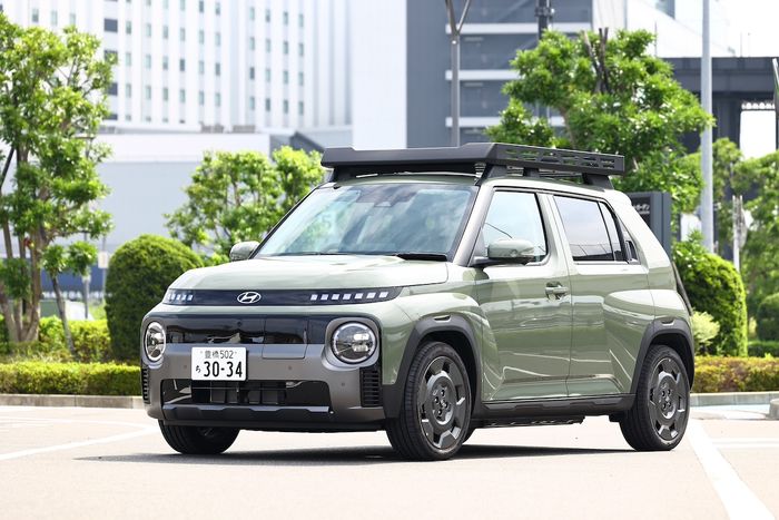 ユニークなデザインと標準装備のルーフキャリアまずインスターについて軽く触れておくと、アイオニックやコナなど大ぶりのSUV、しかもハイパワーなモデルを中心に日本市場に導入してきたヒョンデが放つコンパクトカーというのが注目ポイント。2025年4月に発売され、日本の軽自動車やコンパクトカーと真っ向勝負となるEVとして話題になった。ただ小さいだけではなく、ユニークなデザインもただ可愛いだけではない。細かい作り込みがされた造形で、安っぽさがまったくないのは驚きだ。肝心のEV性能も一充電で458km(ラウンジ)と小型車の常識を超えるもので、それでいて価格は357万5000円(ラウンジ)という価格を実現している。そのインスターに新たに加わったのがクロスで、その名のとおり、SUV的なグレードとなる。ルーフレールや黒いホイールアーチなど、そもそもアウトドア感を演出しているインスターに対して、さらに前後のバンパーやホイールなどのデザインを変更。そして何と言っても目を引くのがルーフバスケットだが、これを標準装着しているのだ。ルーフラックは使い方に合わせてアフターで購入するのが普通だが、それを標準装備しているクルマはおそらく史上初。自由自在でユニークな発想はヒョンデの魅力と言っていいだろう。