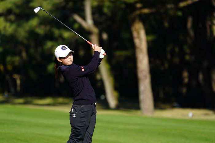 最終18番、5メートルのパットを読み切ってバーディを奪い「72」で踏みとどまった。初日はドライバーが乱れ、3オーバーの14位タイと出遅れ。狭く、周囲を林に囲まれたコースではティショットの精度は生命線になる。しかし2日目は「林にも行かず、ドライバーがよかった。アイアンの調子も悪くない」と、遅れを取り戻す一日に。スコアは変わらずだが、順位は一気に3位まで浮上した。平均260ヤードの飛距離が武器だが、それは風の場面でも効果を発揮する。「ヘッドスピードが速いからか、風の影響をもともと受けづらいんです。ティショットでは風を読みすぎず、思い切って打てます」。この特性を最大限に生かし、あとはウェッジを握る場面などで神経を研ぎ澄ました。団体戦は首位の韓国と4打差の2位。個人戦もトップと5打差まで迫っている。関西は男子も個人戦首位の小川琥太郎(大阪学院大附高2年)の活躍もあり、団体、個人ともに首位。“男女完全制覇”も見える位置だ。「自分がよければチームにも貢献できる。とりあえず自分のプレーに集中します」。前日は不安定だったドライバーも「いい感じできている」と、すっかり手ごたえも取り戻した。勝負強さはプロの舞台でも証明済み。最終日もチームをけん引していく。(文・間宮輝憲)