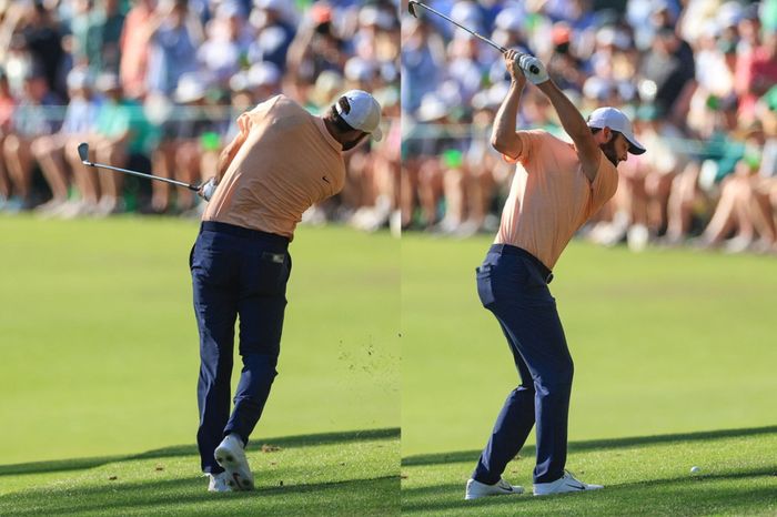 2024年に人生で初めてマスターズを生で観戦する機会に恵まれました。思えばゴルフを始めた小学5年生から、いつかは……と思っていたオーガスタに立つと、まるで夢を見ているような錯覚に陥ったものです。いい経験をさせてもらいました。その中で気づいたことを述べたいと思います。その初日、フェードが必要とされるスタートホールでは、真後ろから選手のスイングが見られる『特等席』に陣取って、全選手のティショットを観察させてもらいました。ボクが記憶する限り、ドローボールを打っていったのは、ブライソン・デシャンボーを含めた数名だけだと思います。ほとんどの選手がフェードボール。もちろんストレートを打つ選手も多いのですが、そのほとんどがわずかにフェード回転していたように思います。改めて現代のゴルフでは、フェードボールの重要性を思い知らされました。そこにはいろんな理由があると思います。ひとつはタイガー・ウッズの出現以来、選手のアスリート化が進んだことがあるでしょう。フェードでも飛ばせるようになりました。飛ぶだけでなく、飛んで止まるボールを打つことが世界のゴルフでは、特にマスターズでは重要なのです。もうひとつはギアの進化で、ボールとクラブが曲がりにくくなっていることも大きく影響しています。余談ですが、プロの指導をしていて思うのは、ドライバーのミスの多くが右へのプッシュ。右に飛び出して、そのまま抜けていってしまうボールです。飛ぶには飛ぶのですが、ドローをかけてもなかなか戻ってこないケースも。それを防ぐためにも、計算しやすいフェードボールが主流になっているのかもしれません。アマチュアの8割から9割はスライサーです。その原因の多くはアウトサイド・イン軌道。かつてはそれを矯正するため、極端なインサイド・アウトでドローボールを打たせていました。しかし今後は、腕とクラブが外から下りる動きは直すにせよ、フォローでインサイドに振り抜くことも同時に教える必要があります。もちろんそのためには、ドッシリとした下半身、ブレない軸が重要になります。改めて『ゴルフは傾斜地で打つスポーツ』だということを、オーガスタは教えてくれました。足裏は、唯一、地球と接している体の部位です。ドッシリと構えるためには、足裏でしっかりと地面をつかまなければなりません。これまでボクはスイングでは、体を足裏の四点で支えている、と教えてきました。四点とは両足それぞれのツマ先とカカトです。ところが、そもそもコース全体がアンジュレーションのきついオーガスタでは、ときに三点、あるいは二点、状況によっては一点で立つ、それもドッシリと立つことが求められるのです。たとえばアーメンコーナー最後の13番パー5。2オンを狙うセカンド地点は、大きなツマ先上がり&左足下がりの複合傾斜。通常、このライではフックボールが出やすく、しかもロングアイアンで打つしかない。ピンが右に切られた場合、優勝したスコッティ・シェフラーなどは高いフェードで、右サイドを狙ってくるのです。思うに右足を宙に上げるくらいの意識で、左足カカト一点で立っているのではないでしょうか。『練習場シングル』という言葉があります。平坦な場所では足裏四点で、安定した立ち方ができます。しかしコースは、もちろんオーガスタほどではないにせよ、すべてのショットは傾斜地から打たなければなりません。もちろんスイングの基礎を作るには、練習場では四点でしっかり立つことは大切です。しかし、ある程度スイングができたら、板やタオルなどを足裏で踏んで、ツマ先上がりや左足下がりなどの傾斜から打つ練習も必要でしょう。足裏二点や三点で立つコツも覚えられます。そうすると必然的にハーフショットかせいぜいスリークォーターショットと、スイングはコンパクトになるはずです。アマチュア時代のタイガーは、マスターズの複雑な傾斜の洗礼を受けました。ややオーバースイングでシャフトクロスのスイングが、大きく変化していったのはマスターズを経験した後からでした。その後、1997年に史上最年少でのグリーンジャケット、5回の優勝のドラマは、こうして生まれたのです。■辻村明志つじむら・はるゆき/1975年生まれ、福岡県出身。上田桃子らのコーチを務め、プロを目指すアマチュアも教えている。今季は千田萌花と藤本愛菜をプロテスト合格に導いた。読売ジャイアンツの打撃コーチとして王貞治に「一本足打法」を指導した荒川博氏に師事し、その練習法や考え方をゴルフの指導に取り入れている。元(はじめ)ビルコート所属。※『アルバトロス・ビュー』893号より抜粋し、加筆・修正しています◇ ◇ ◇ ●女子プロのダウンスイングを分析! 関連記事「原英莉花、竹田麗央、河本結……同じ球筋なのに“下ろし方”は全然違う! 女子プロ10人のダウンスイング比べてみた」で各選手の特徴をチェック