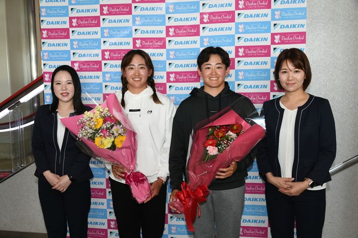 <ダイキンオーキッドレディス 事前情報◇2日◇琉球ゴルフ倶楽部(沖縄県)◇6610ヤード・パー72>5日から始まる今季の国内女子ツアー開幕戦を前に、那覇空港で花束贈呈セレモニーが実施された。2日には2024、25年と大会連覇中のディフェンディングチャンピオン・岩井千怜と、昨季の米女子ツアーでルーキーイヤーながら初優勝を果たした岩井明愛をお出迎え。花束で歓迎された。