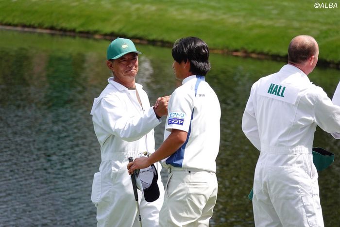 「日本オープン」昨年優勝の資格で初出場する片岡尚之は、父・誠之(せいし)さんと親子タッグで参戦。1オーバー・13位タイで終えた。舞台はオーガスタ・ナショナルGCの敷地内にある9ホール、パー27のショートコース。アップダウンに加えて池が絡む、難度の高い設計となっている。打ち下ろしでグリーン奥に池が広がる1番は、奥のエッジから2パットでパー発進とした。1アンダーで迎えた8番では強い向かい風の影響もあり、グリーン手前の池に捕まった。それでも最終9番では、ピン奥3メートルにキャリーさせてバックスピンで戻し、約2メートルを沈めてバーディ締め。大勢のパトロンから拍手と歓声が送られた。ホールアウト後には「めっちゃ楽しかったです」と笑顔。地元・北海道在住の父とは、プロ転向後に会う機会も少なくなった。「こうして一緒に過ごすことも稀。ラウンドは15年くらい一緒にしていない。同じフェアウェイを歩くことがひさしぶりだったので、すごくいい経験になりました」と振り返った。世界最高峰の舞台で果たした“親孝行”。「最初で最後の親孝行です」と照れ笑いを浮かべ、ホールアウト直後には誠之さんとかたい握手を交わした。同組でプレーしたのは、マスターズ3勝のニック・ファルド(イングランド)。「すごかったです。体も大きくて上手」と感銘を受けた。一緒に回れてすごく光栄でした。本当に面白かったです。冗談も言っていて(笑)」。片岡のウエアのスポンサーロゴを見て、『many many sponsors!』と声をかけられるなど、会話を交わして笑い合う場面もあった。会場入り後は練習ラウンドや調整に集中する日々が続いていたが、この日は少しだけ気持ちが軽くなった。「コースがすごく難しくて、そのことばかり考えていたけれど、少しリフレッシュできて気持ちが軽くなりました」と話す。「(本戦も)こういう楽しい雰囲気でできたらいいなと思う。あしたも楽しみながら頑張りたいという気持ちになりました」。明るい表情をで、あすの開幕に向けて最終調整に励んだ。(文・高木彩音)