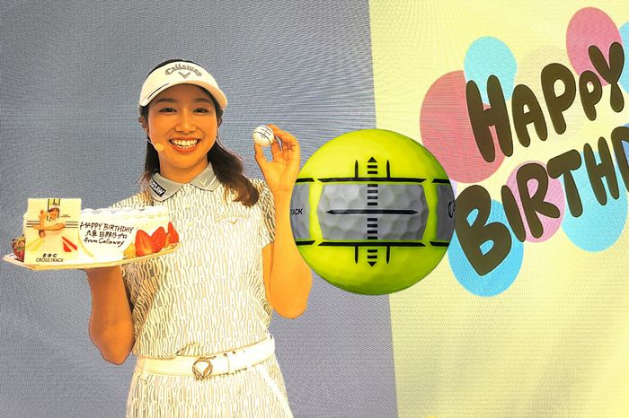 この日が24歳の誕生日。クロストラック柄のケーキで祝福されて「ラインがたくさん入ってる!」と喜びつつ、誕生日の過ごし方や予定についてMCから問われて「全然……。家でゆっくりしたり、家族とおめでとうって言ったり。特に……ないです」と苦笑い。 本題に戻り、パット時のグリップ強さに悩むアマチュアの質問に「ヒヨコをちょっと潰すくらいの強さ。パターは動きが出るとあまり良くないので、ちょっと潰して抑えるくらい」と助言。方向性は良いものの、マスターズ級の高速マットで距離感は難しそうだった。