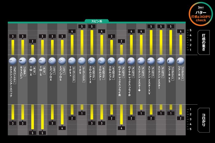 パターで重要なのはフィーリング。自分のイメージとコロがりが一致することが大事だ。今回は、プロゴルファーの海老原秀聡が31種のボールを打った感触の重さとコロがりを、5段階で数値化してくれた。 【ロボット&プロで試打検証】ドライバー〜パターまで飛距離、スピン量……試打データを全公開 パターに関しては、ショットのような弾道データを取りにくく、フィーリングが重要ということもあり、海老原に試打してもらって...